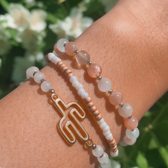 Add a touch of desert charm to your style with our Cacti-Inspired Bracelet! This dainty piece features a cute cactus-shaped gold connector at the center. The natural pinkish-white beads, paired with shimmering gold accents, create a balanced, elegant and chic look.
