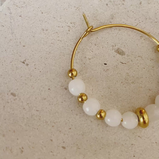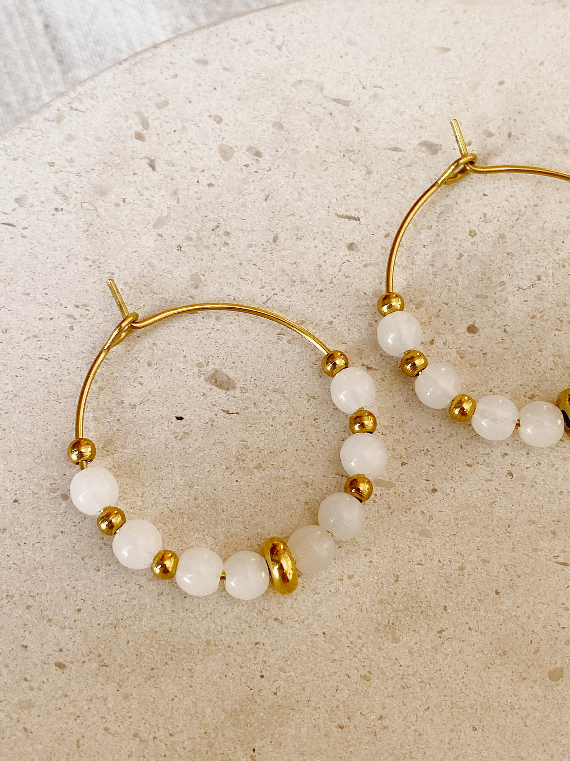 Add timeless elegance to your everyday look with these simple yet striking hoop earrings. Featuring a mix of glossy white beads and shiny gold accents, they’re lightweight and versatile — perfect for dressing up casual outfits or adding a subtle touch of sophistication to evening wear.